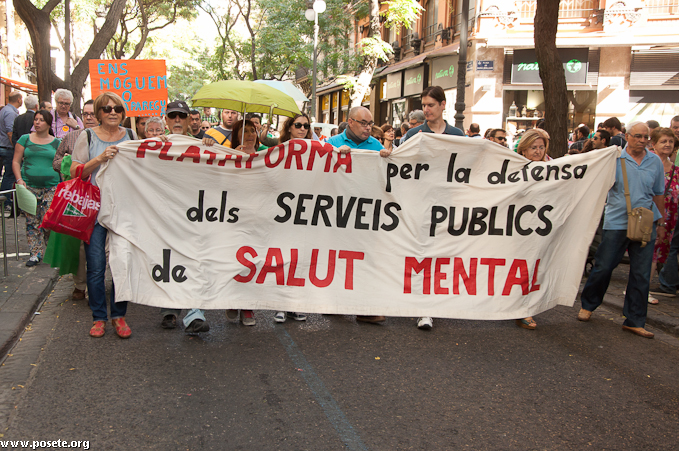 Hoy Domingo 26 de Octubre, nos hemos manifestado unas cuatrocientas personas en la Plaza de la Virgen por una sanidad pública y de calidad. El “desgobierno” del PP nos ha dejado sin ley de dependencia, con el copago farmaceútico y de hospitales de día. Hoy hemos sido más gente que en ocasiones anteriores, pero aún así debemos ser más. Mi psiquiatra me comentó en una de mis sesiones con ella que hay un veinte por cien de población con alguna enfermedad mental: esquizofrenias, depresiones, manías, fobias, etc… Si en Valencia somos un millón de habitantes, ¿dónde están las doscientas mil personas afectadas? Hay que salir a la calle, manifestarnos, y dar por saco a los que nos desgobiernan. Si somos pocos, se ríen de nosotros, los muy inmorales.