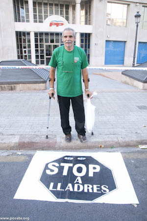 El ciudadano de abajo me pidió una foto con la pancarta, él y la fachada de la sede del PP. Espero que te guste, amigo.